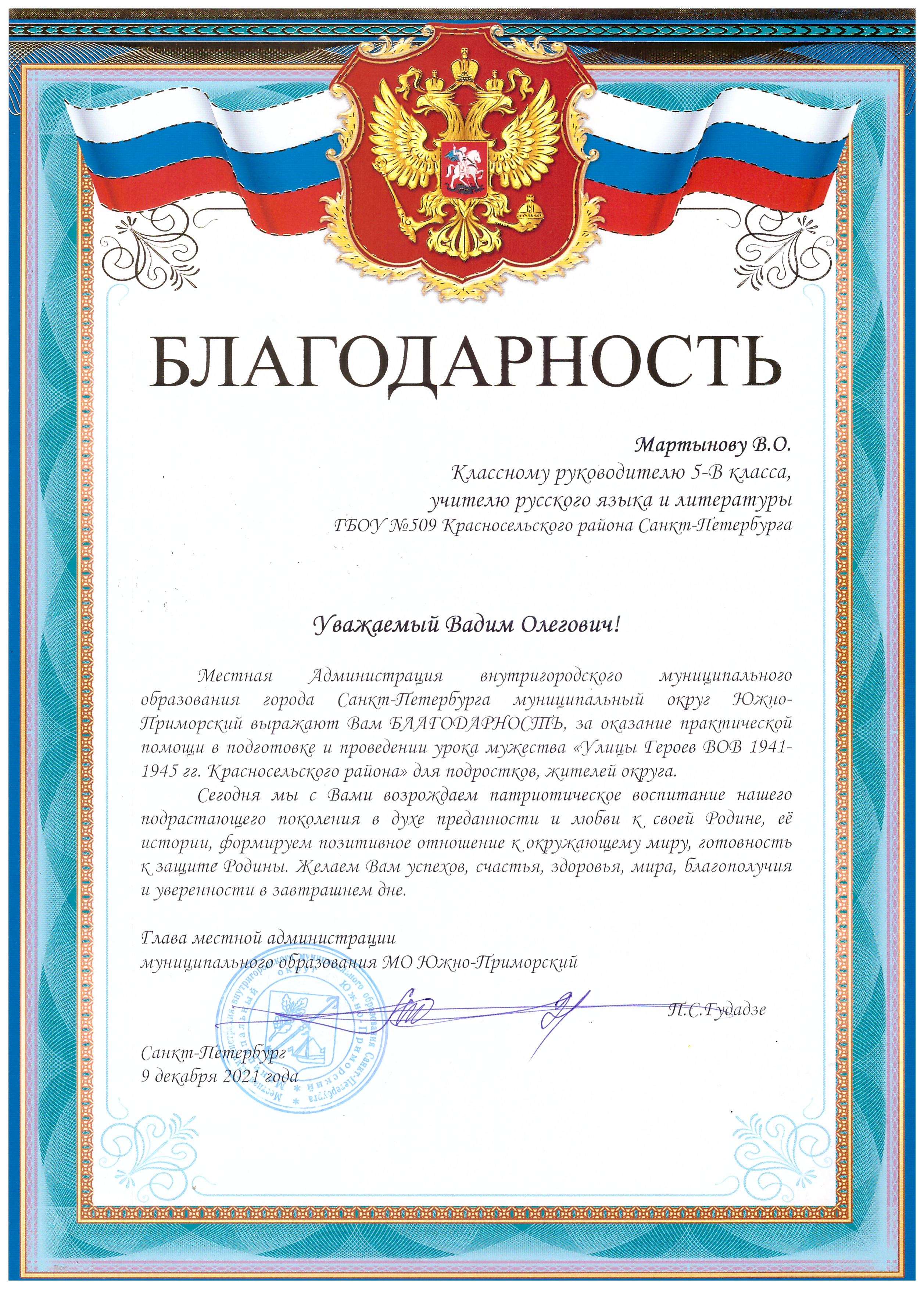 - Благодарность от администрации внутригородского муниципального округа Южно-Приморского за оказание практической помощи в подготовке и проведении урока мужества «Улицы Героев ВОВ 1941-1945 гг. Красносельского района» для подростков, жителей округа (2021)