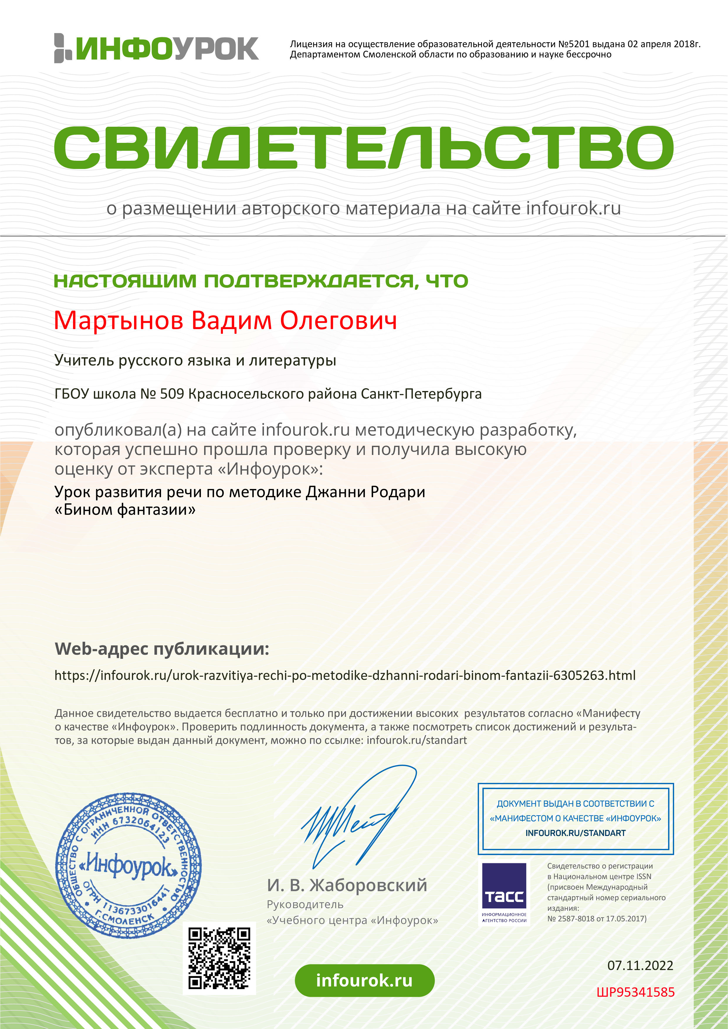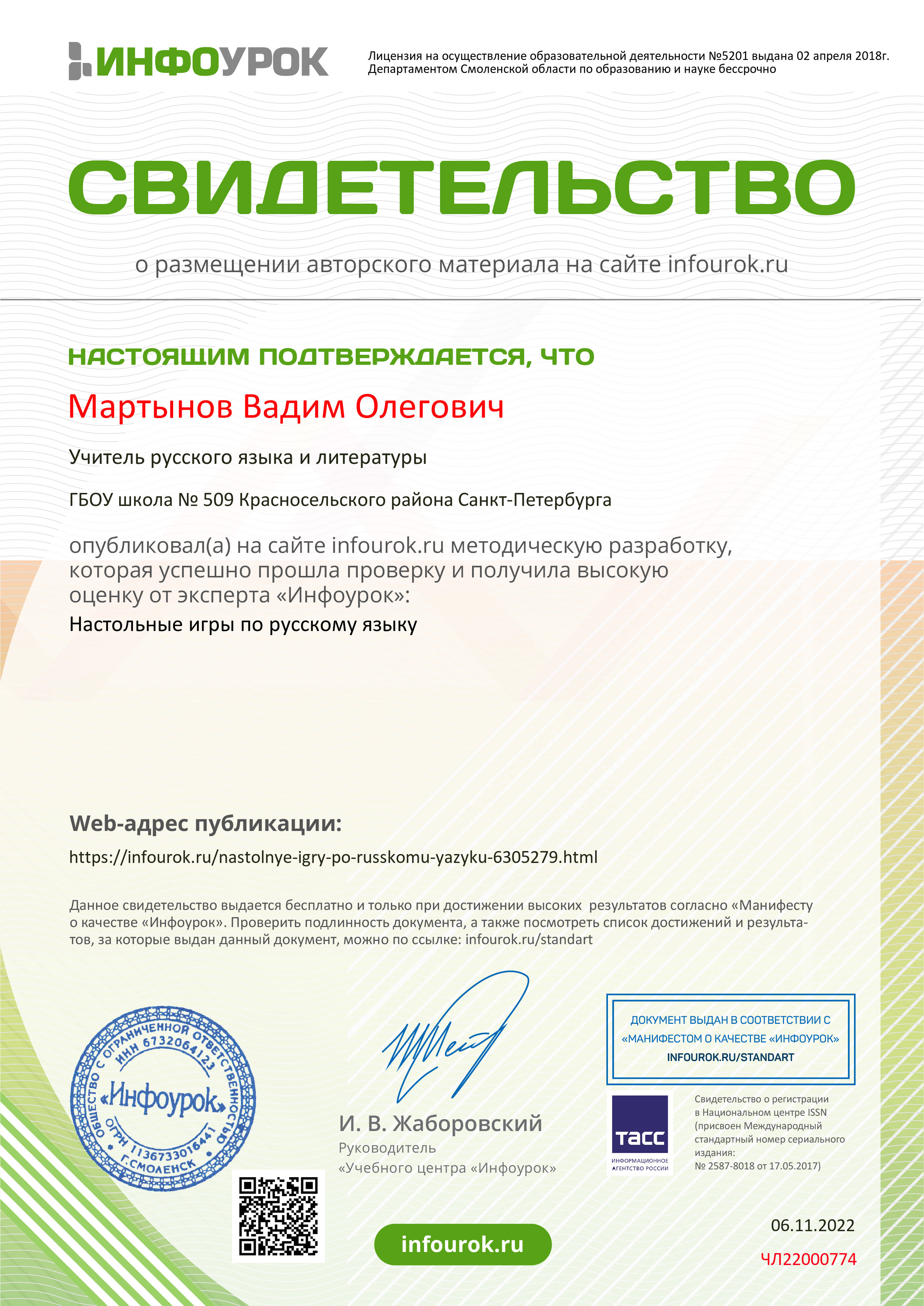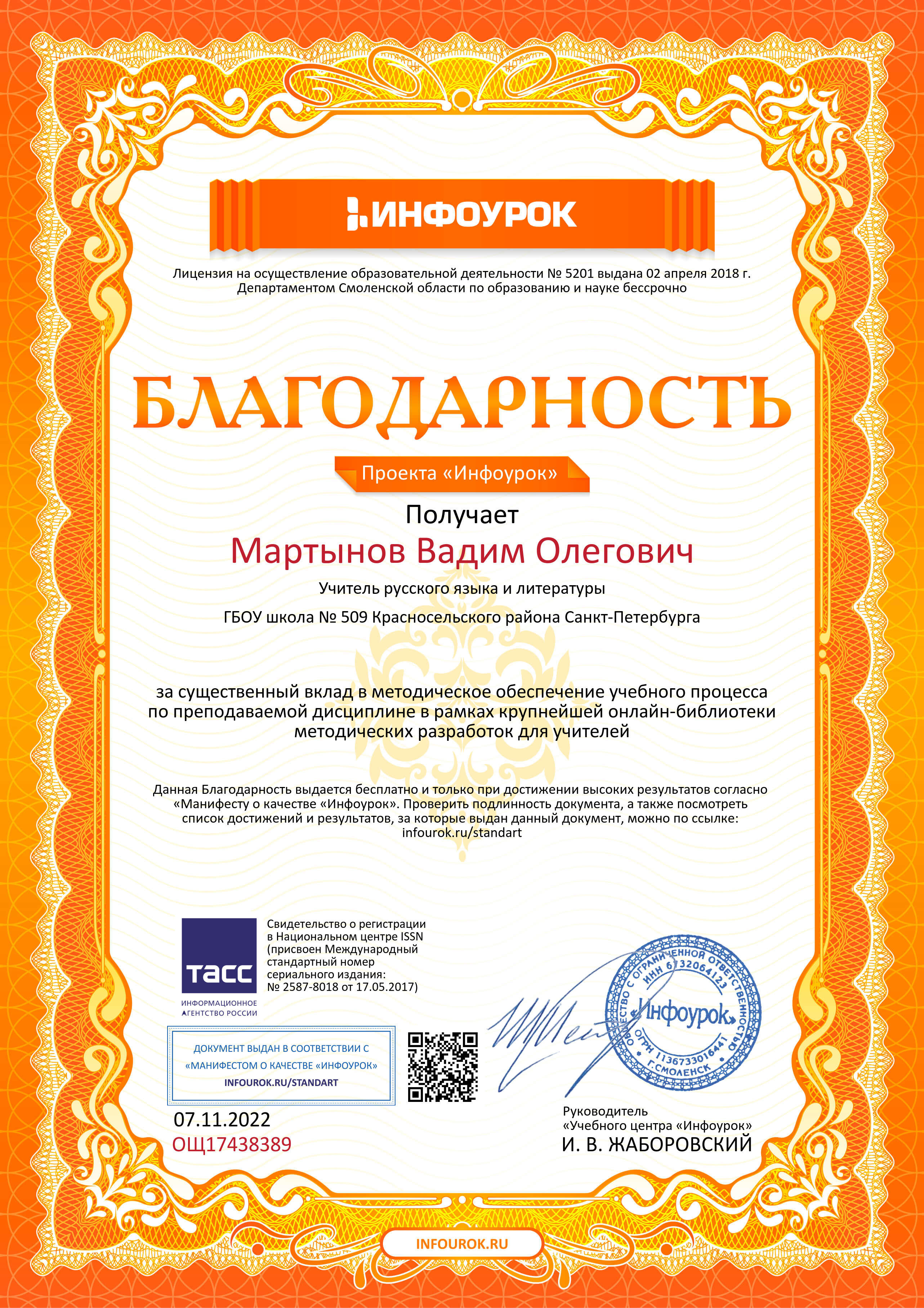 - Благодарность от проекта «Инфоурок» за существенный вклад в методическое обеспечение учебного процесса по преподаваемой дисциплине в рамках крупнейшей онлайн-библиотеки методических разработок для учителей (2022)