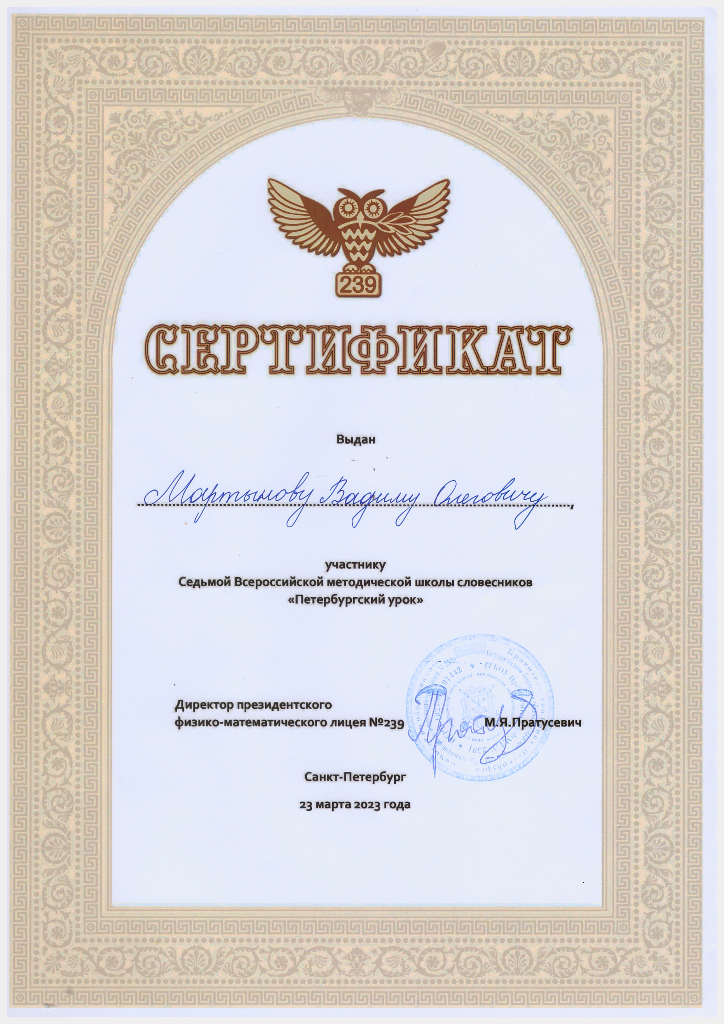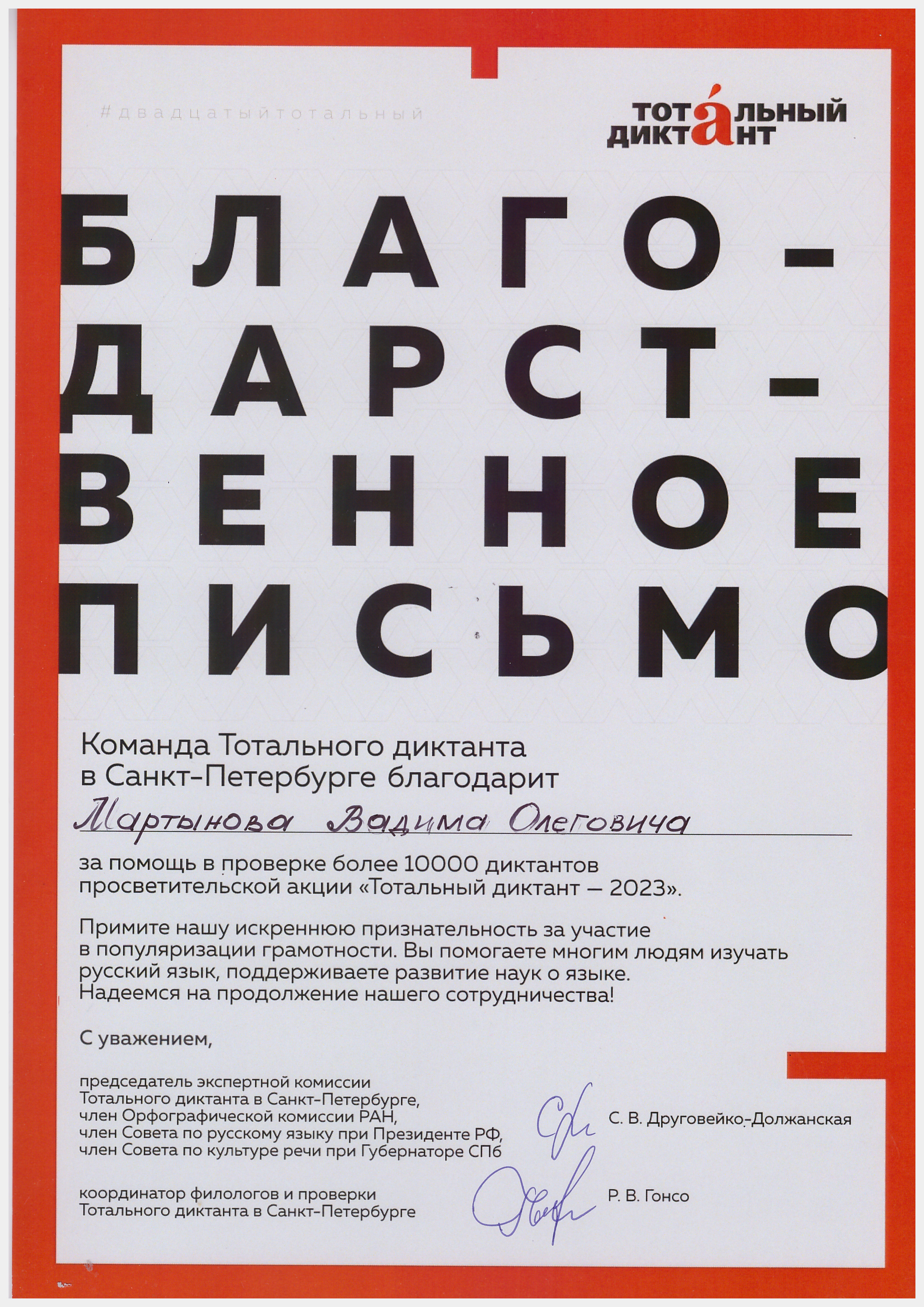 - Благодарственное письмо от команды Тотального диктанта в Санкт-Петербурге за помощь в проверке диктантов в просветительской акции «Тотальный диктант — 2023» (2023)