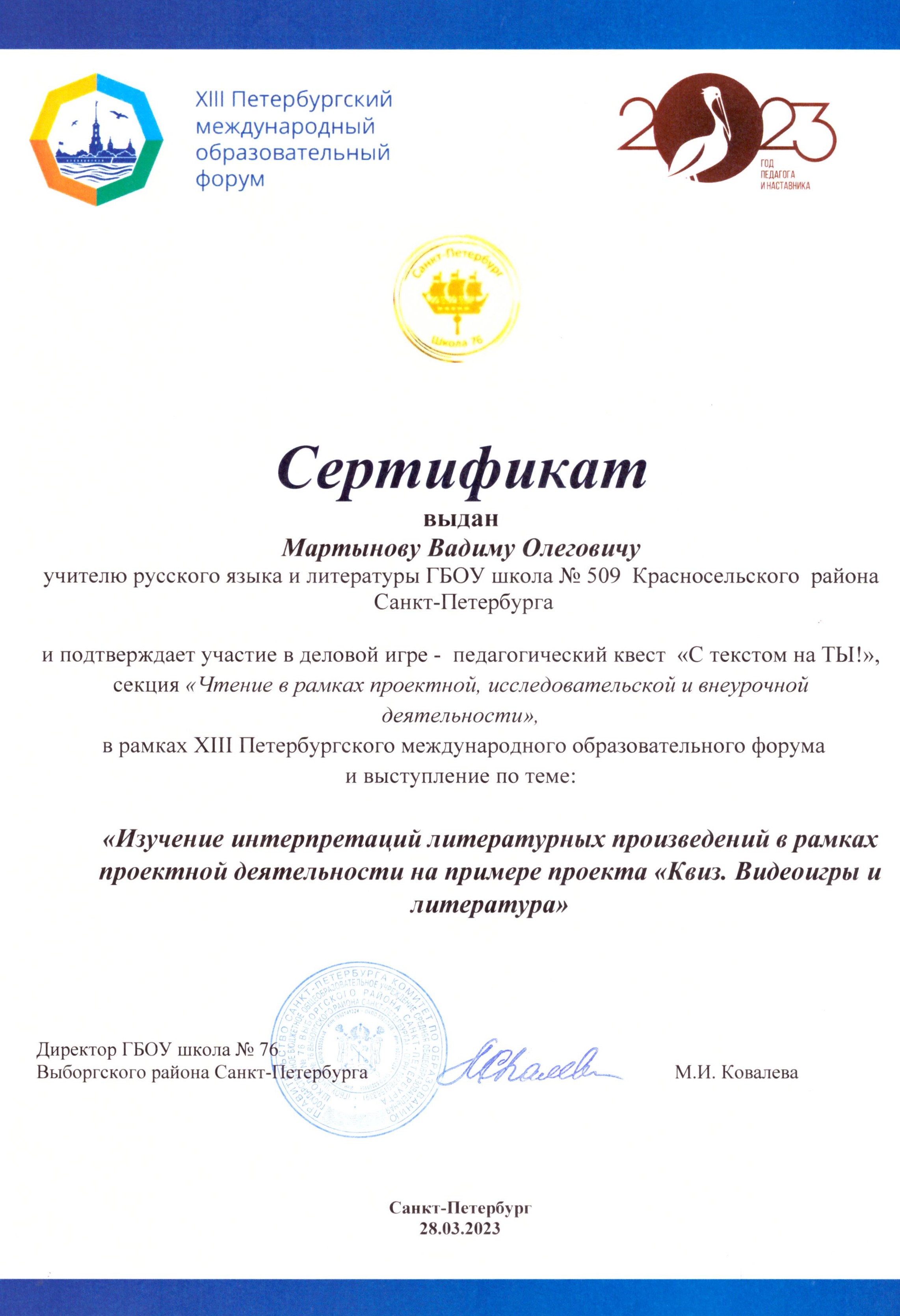 - Седьмая Всероссийская методическая школа словесников «Петербургский урок», 2023 — участник