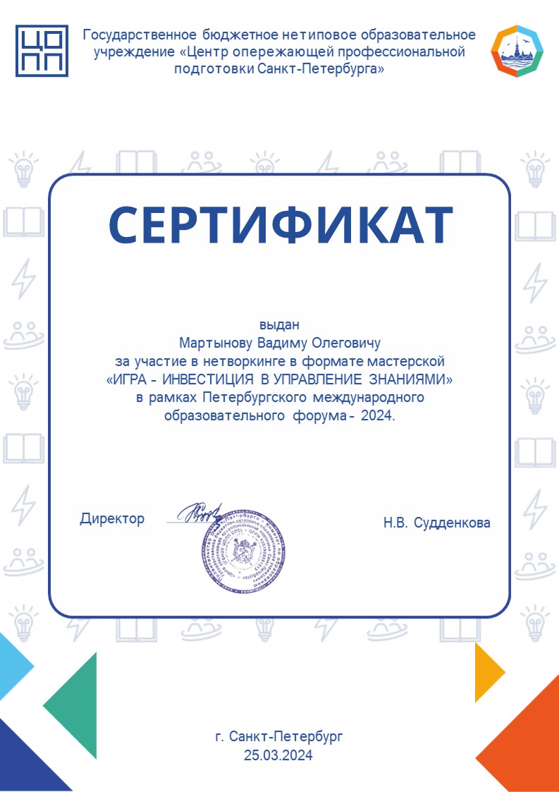 - Нетворкинг в формате мастерской «Игра — инвестиция в управление знаниями» в рамках Петербургского международного образовательного форума 2024, 2024 — участник