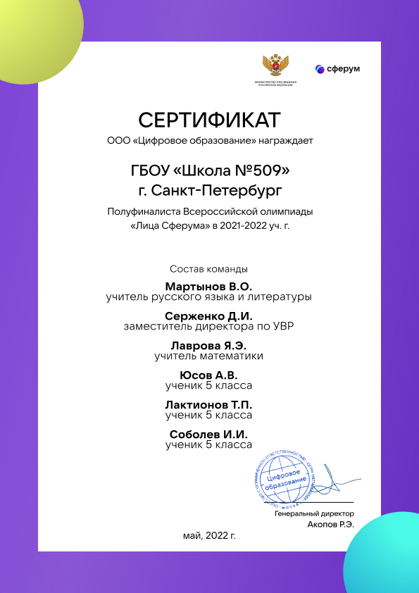 - Всероссийская олимпиада «Лица Сферума» (всероссийский, 2022) — участник