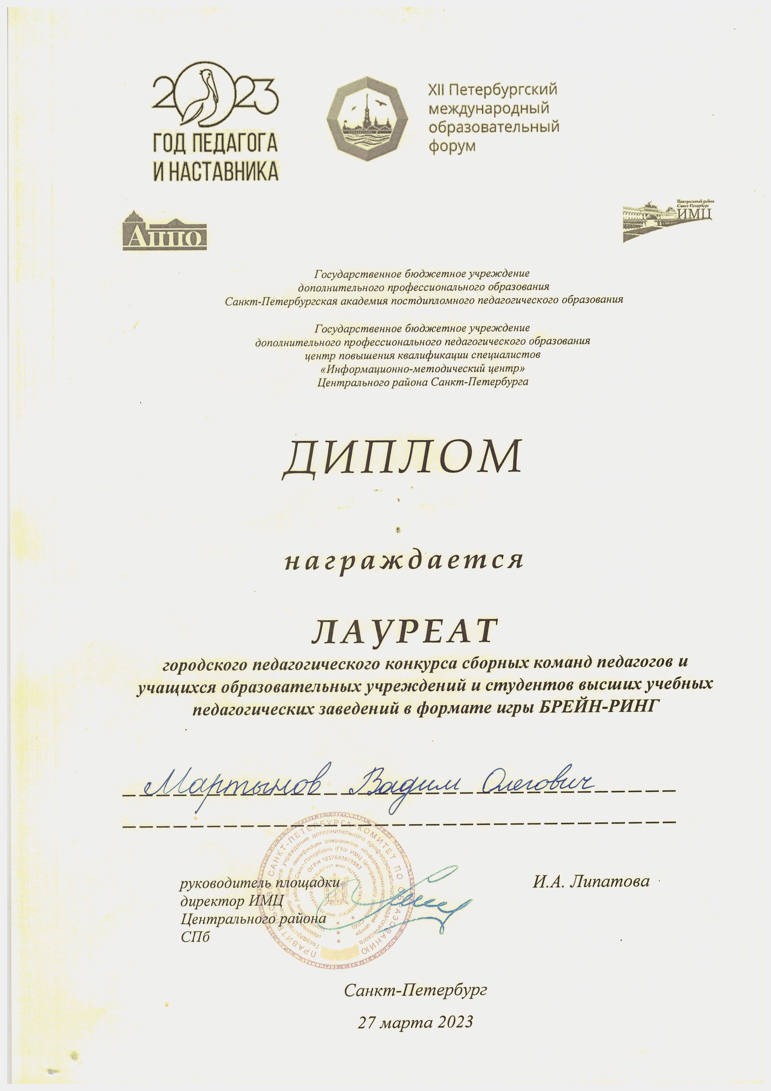 - Городской педагогический конкурс сборных команд педагогов и учащихся образовательных учреждений и студентов высших учебных заведений в формате игры брейн-ринг (региональный), 2023 — лауреат