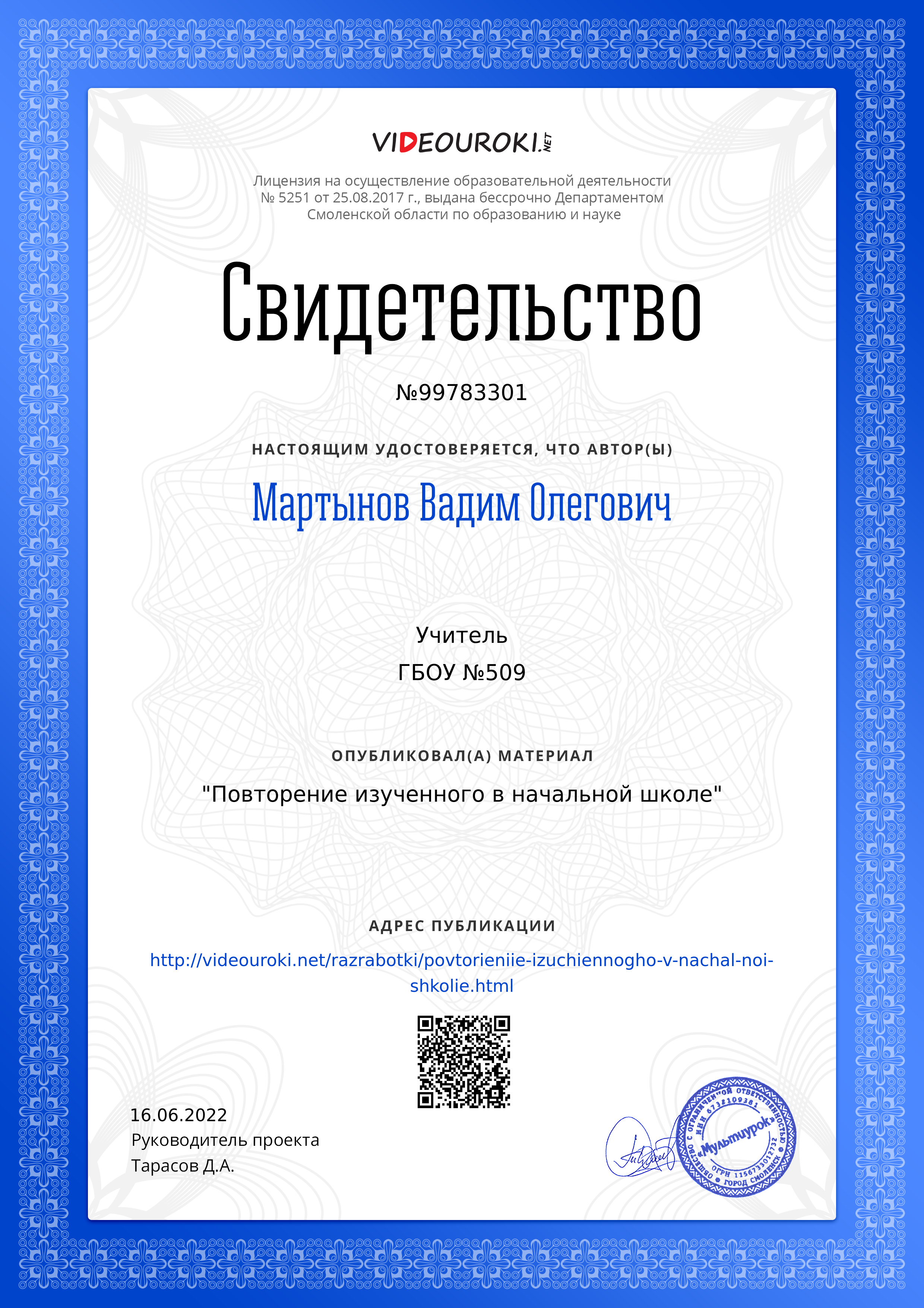 - Благодарственное письмо от платформы Учи.ру за помощь в проведении всероссийской онлайн-олимпиады по русскому языку для 1-9 классов (2022)