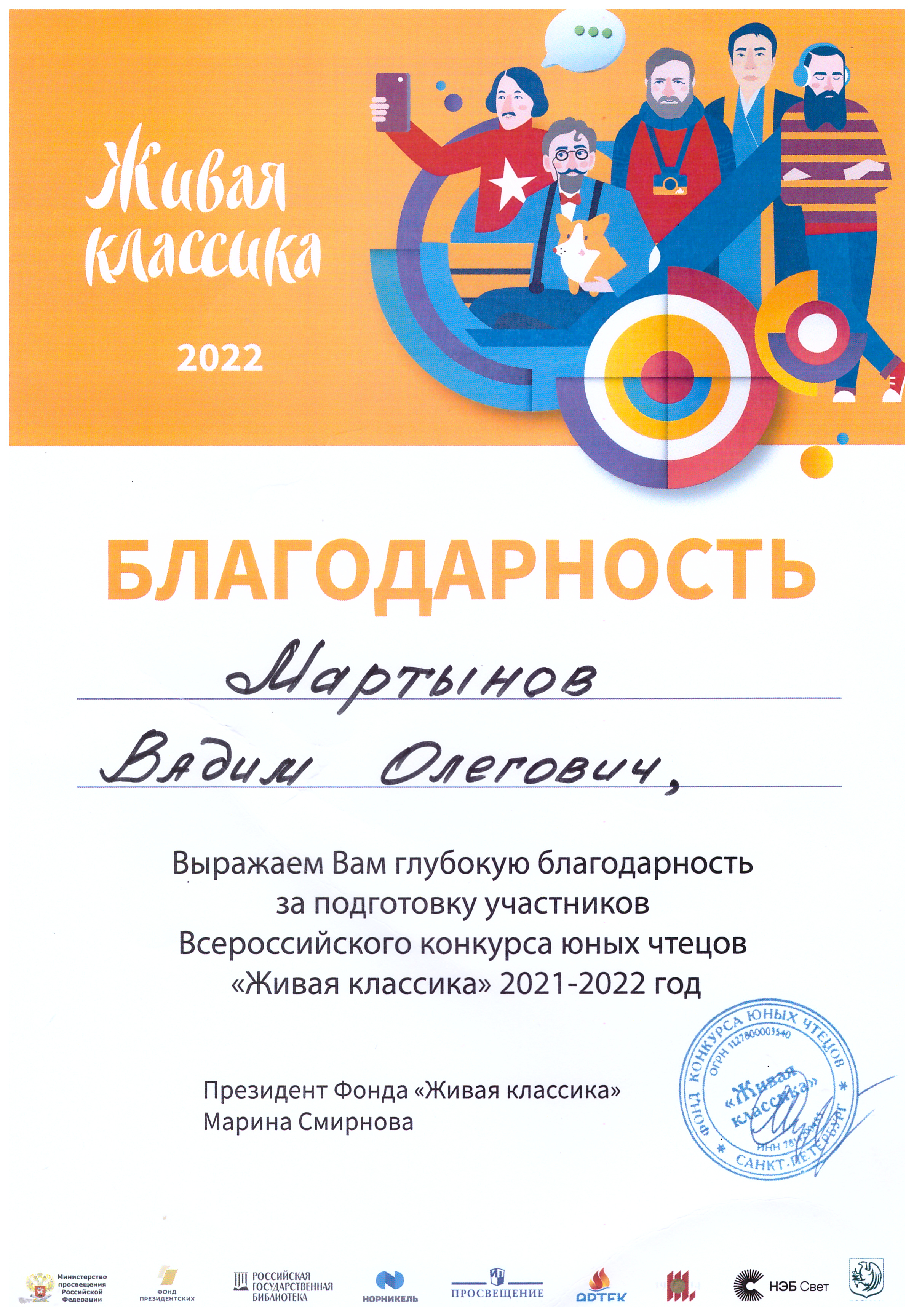 - Благодарность от Фонда «Живая классика» за подготовку участников Всероссийского конкурса юных чтецов «Живая классика» 2021-2022 год (2022)