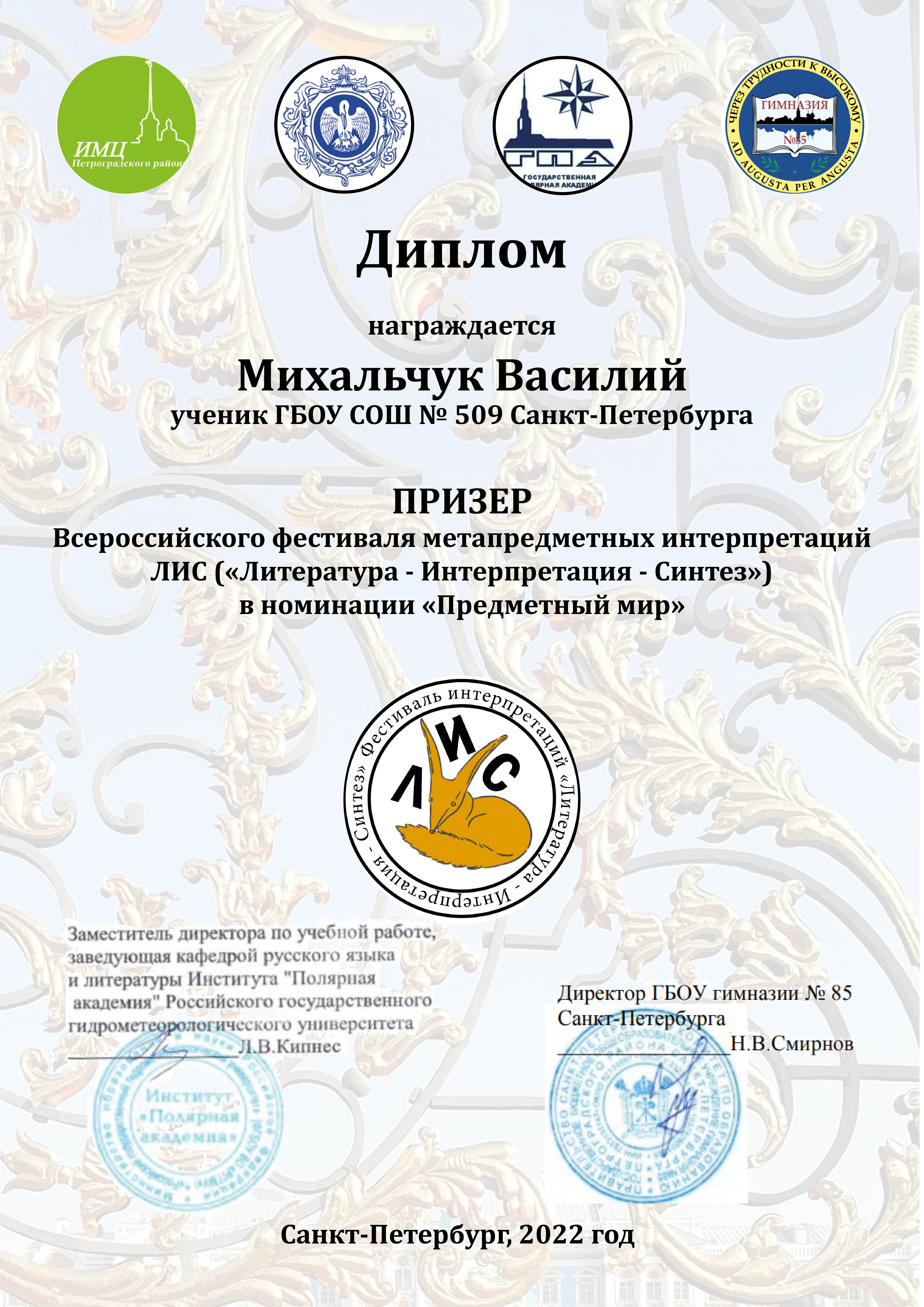 - Всероссийский фестиваль метапредметных интерпретаций ЛИС («Литература — Интерпретация — Синтез») (всероссийский, 2022) — призёр