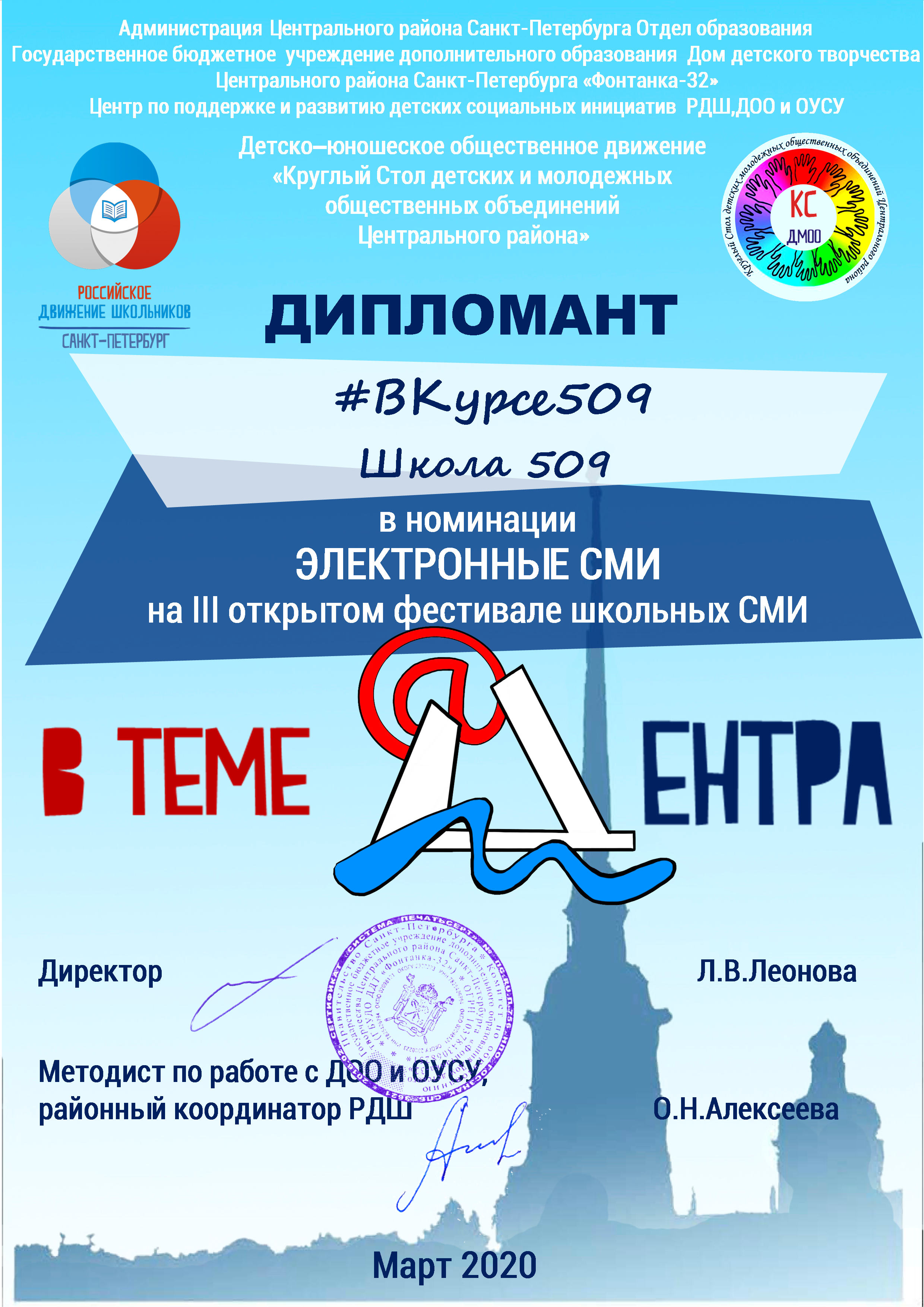 - III открытый фестиваль школьных СМИ «В теме центра» (районный, 2020) — дипломант
